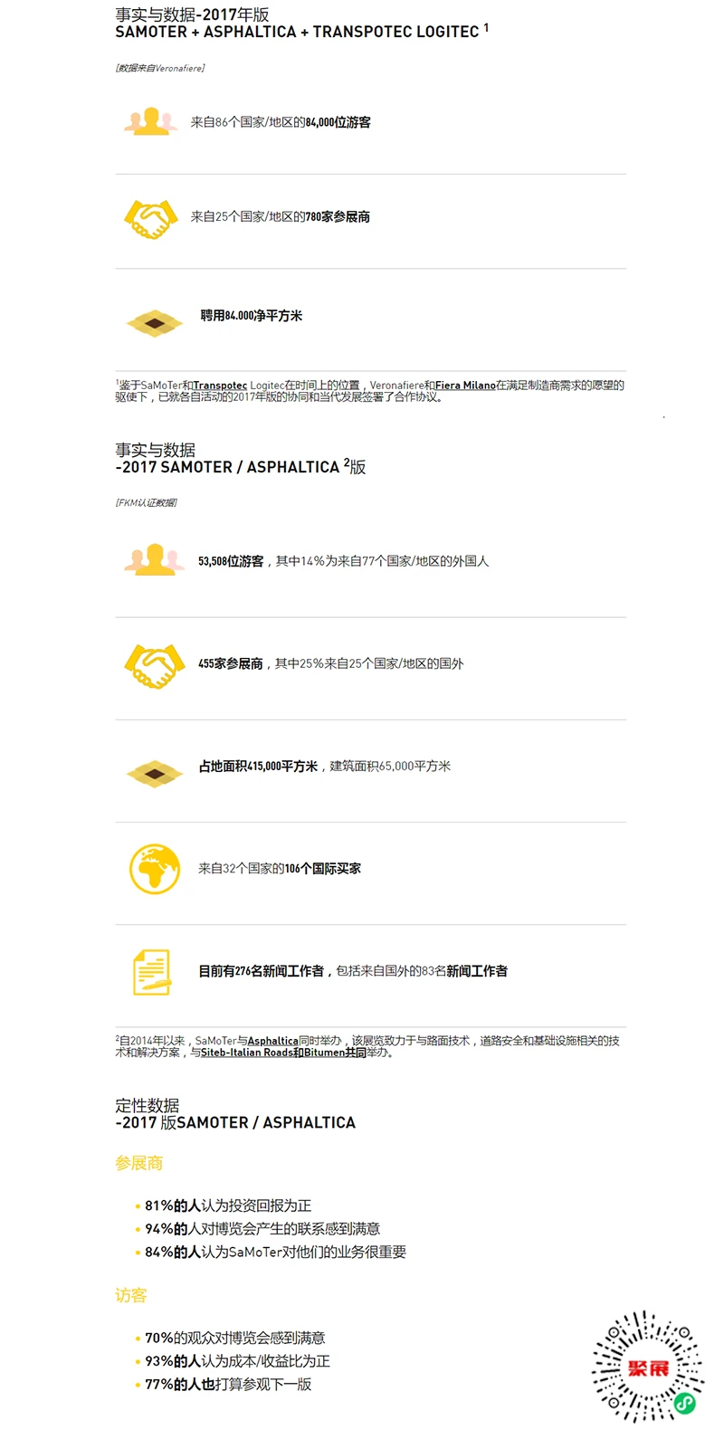 La anterior edición de la feria SAMOTER, celebrada en Verona, Italia, abarcó una superficie total de 118.000 metros cuadrados, con 909 expositores procedentes de países como China, Alemania, Francia, Reino Unido, Rusia, República Checa, España, Brasil e India, y atrajo a 98.048 visitantes.
